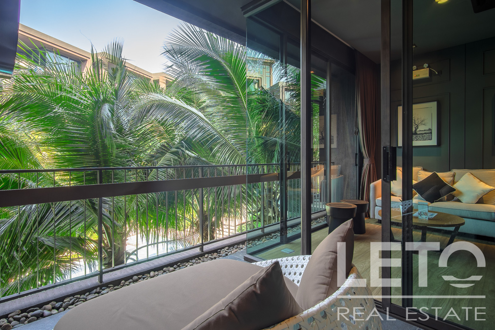 A fully furnished apartment with a view of the pool and tropical greenery.