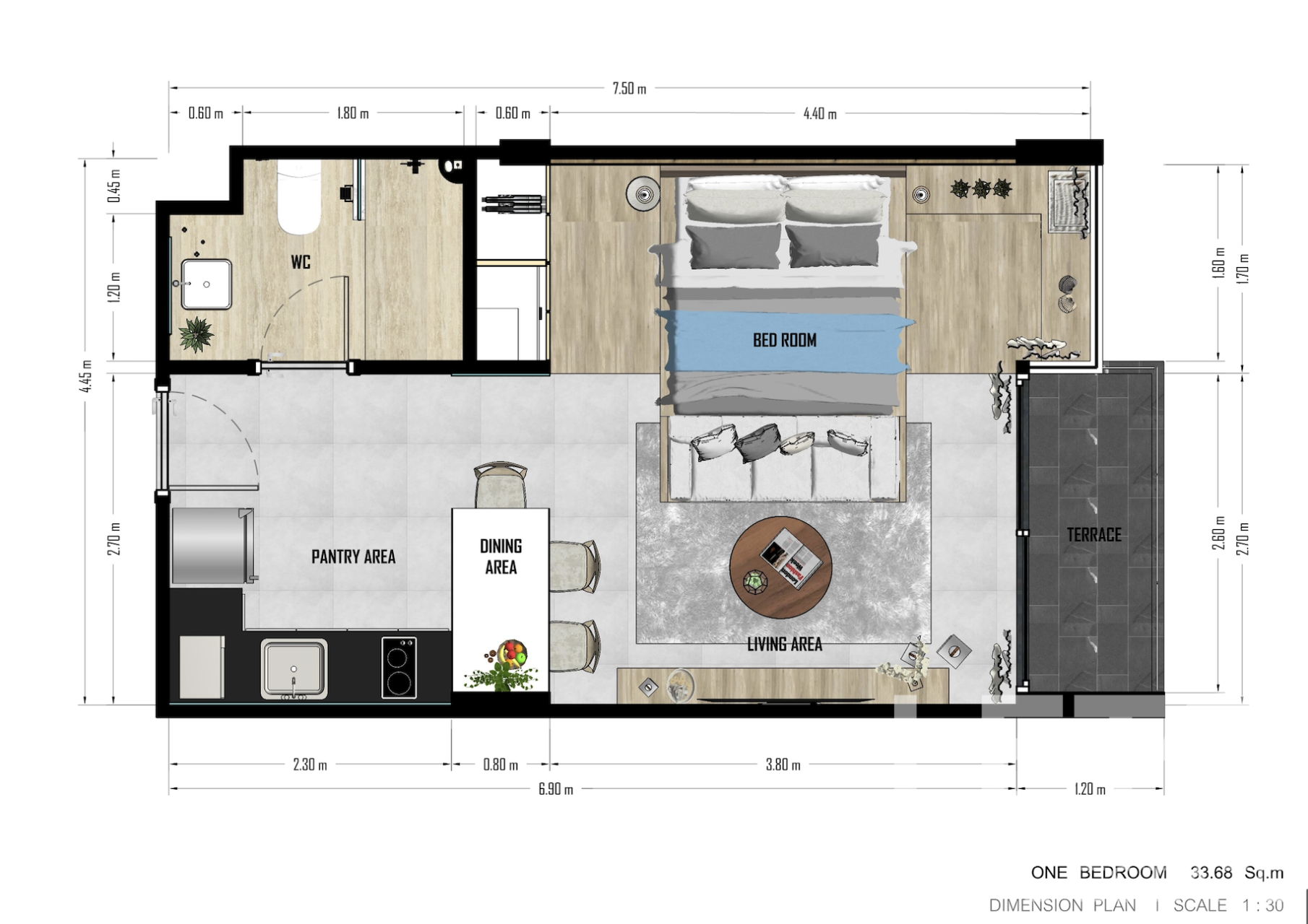 Spacious studio apartment measuring 33.68 sqm with a large bathroom, living area, kitchen, and dining zone. The apartment is located on the second floor of a four-story building. The windows of the apartment offer a beautiful view of the mountains.