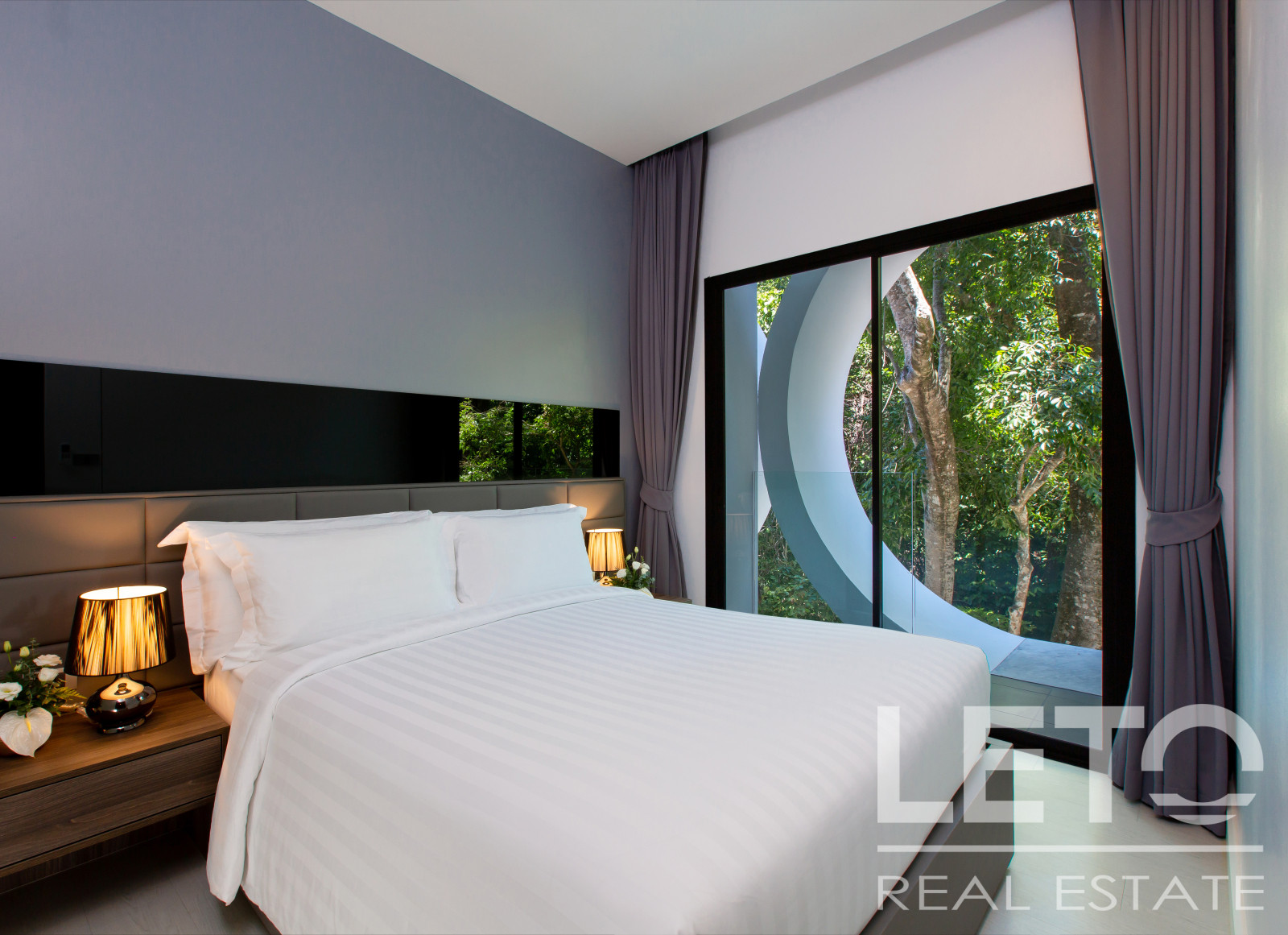 The bedroom in this apartment is a true space for relaxation and tranquility. Panoramic windows provide views of the tropical greenery and open up the room. The built-in wardrobe offers ample storage space for clothing and personal belongings, ensuring organization and convenience.