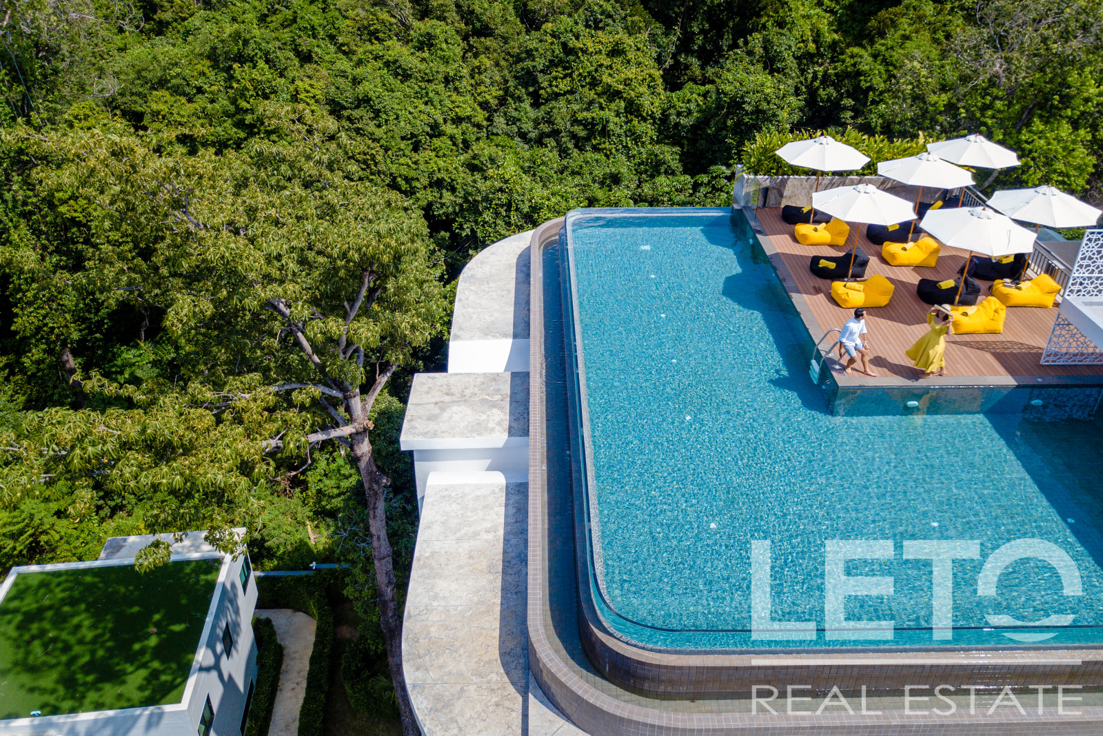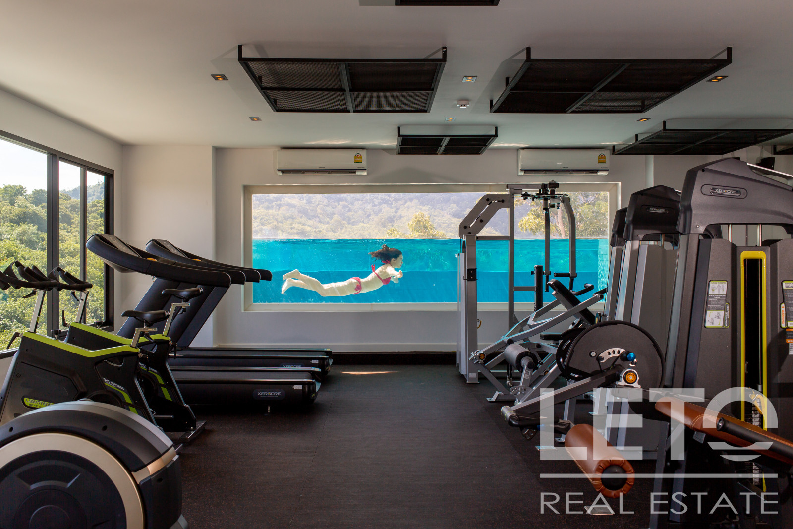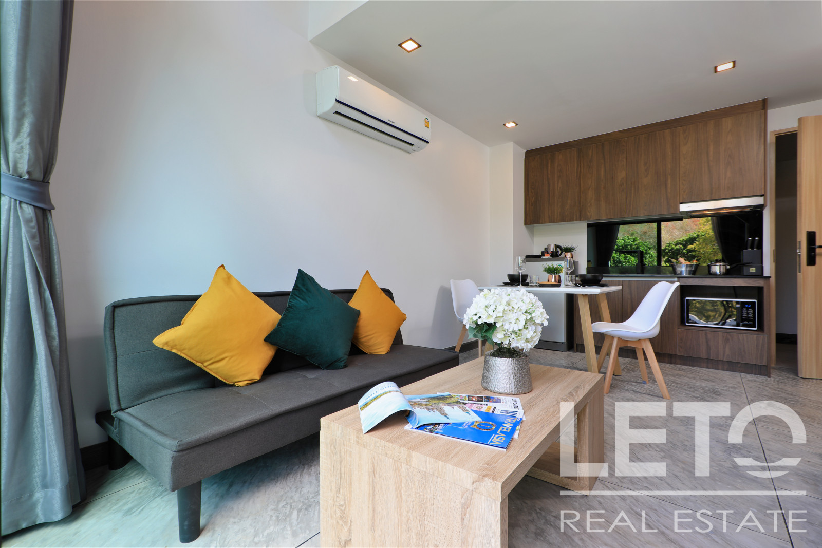 The apartment's panoramic windows offer views of the jungle. The apartment is sold fully furnished.