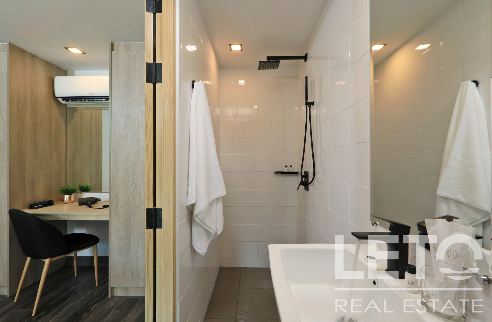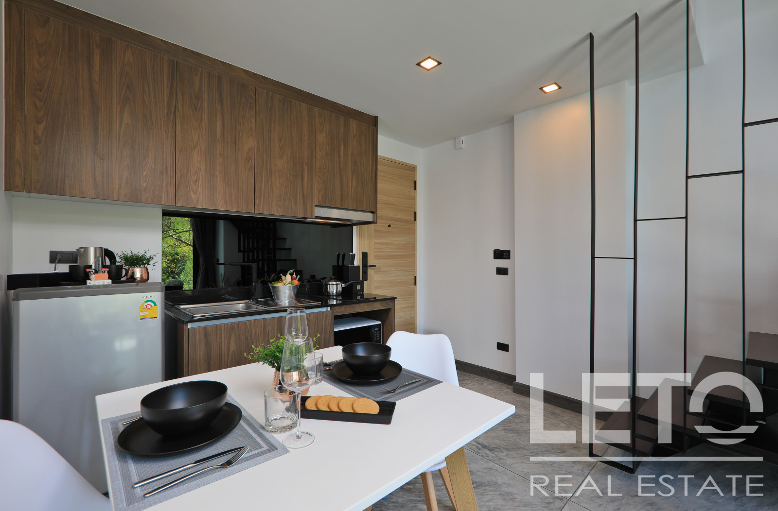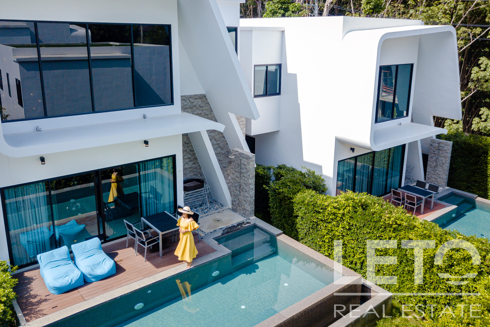 The apartment's panoramic windows offer views of the jungle. The apartment is sold fully furnished.