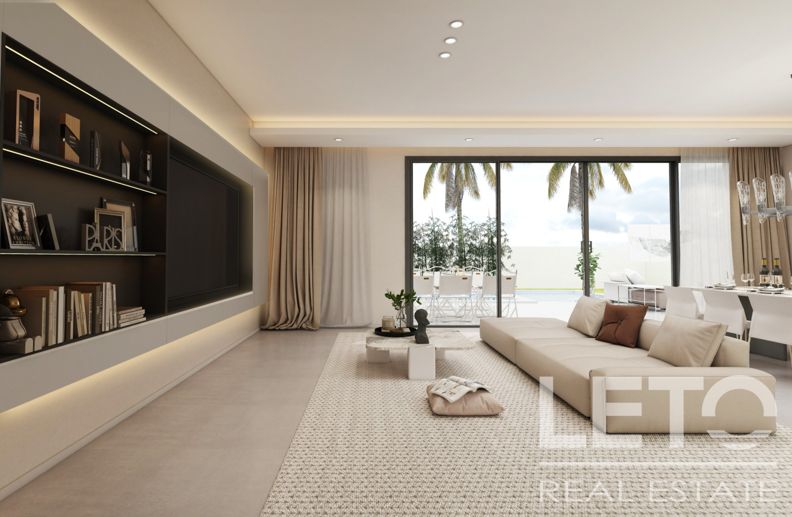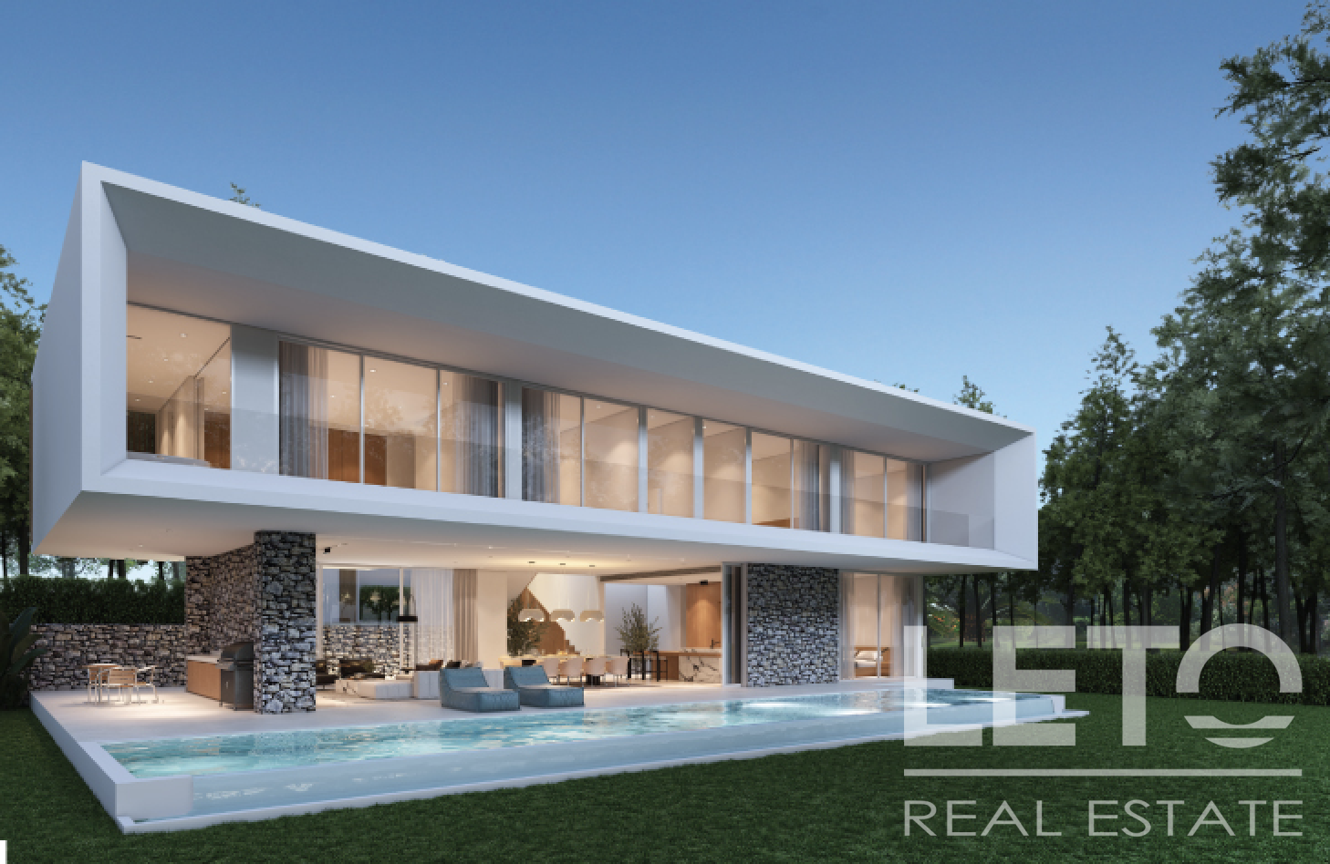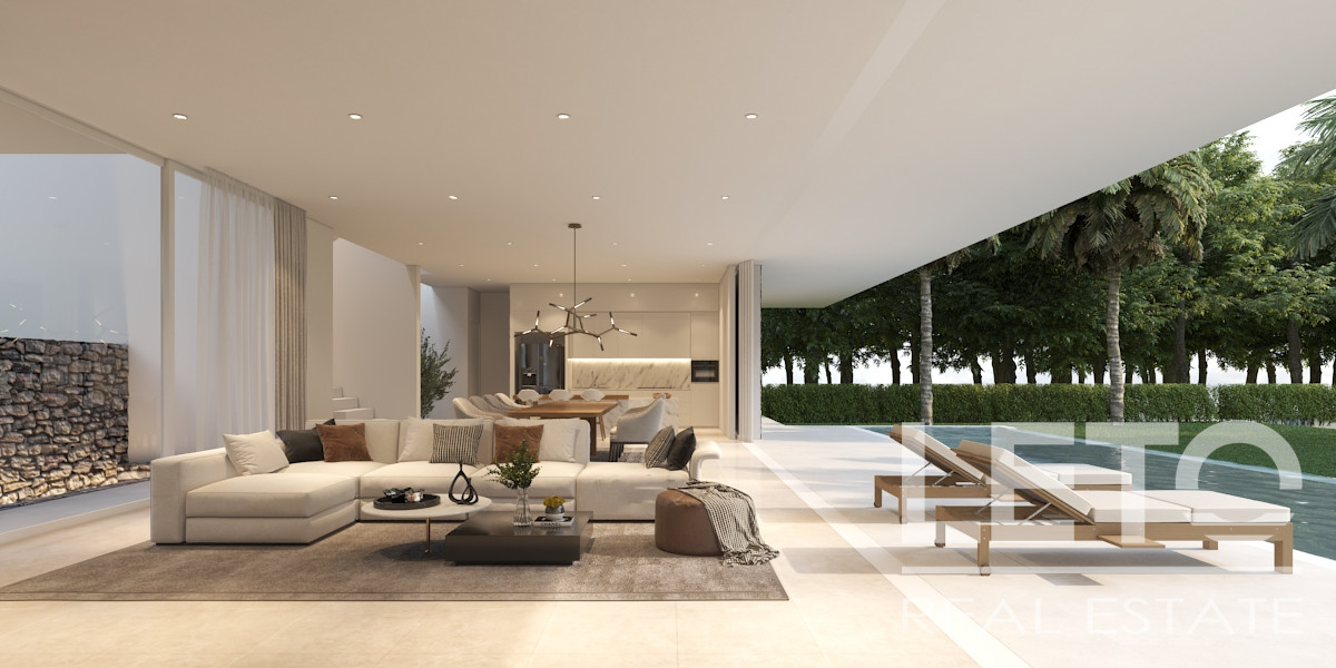 The villa is designed in a minimalist style with clean lines and panoramic windows. The living room and three bedrooms open up to a terrace with a private pool measuring 19 by 3.4 m.