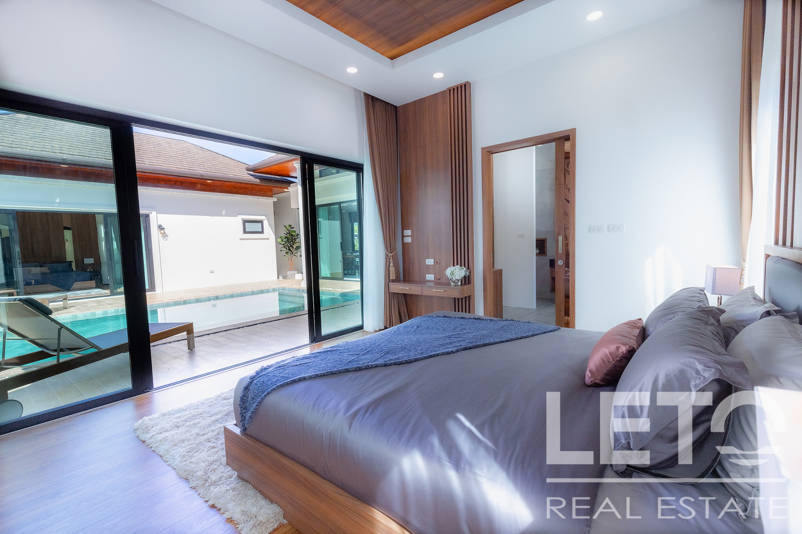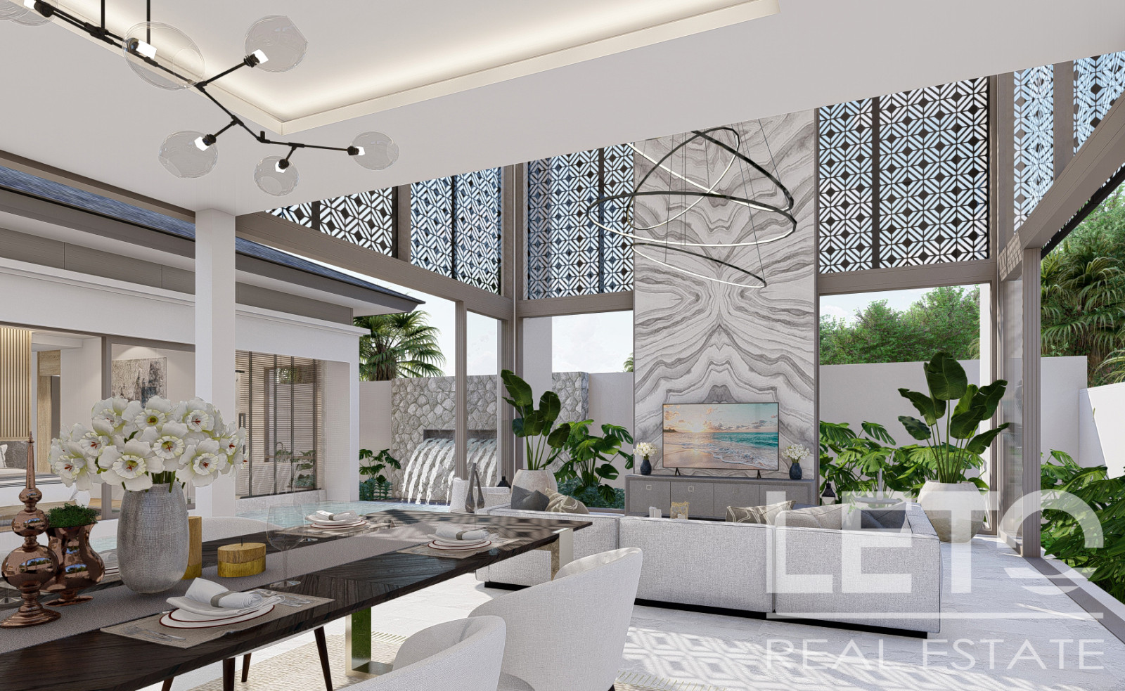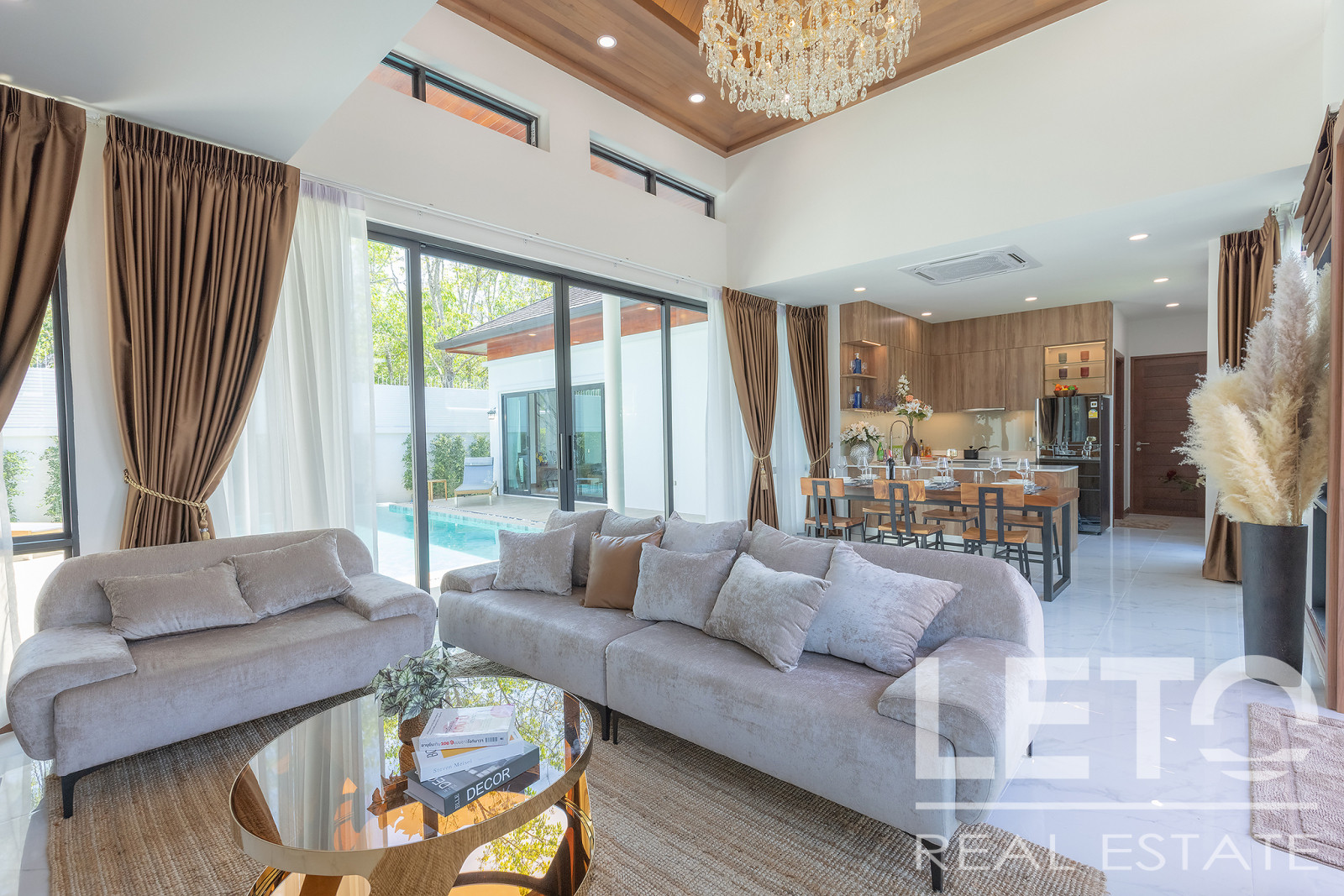 The interior and exterior spaces of the villa are thoughtfully connected, allowing guests to enjoy a secluded retreat on the poolside terrace or fully unwind in the comfortable living room.