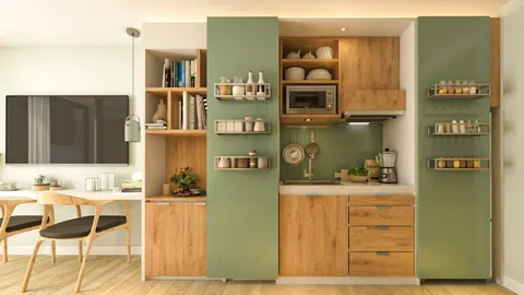 Материалы, используемые для кухонных шкафов и столешницы, также являются экологически чистыми, что соответствует целям проекта в области устойчивости.