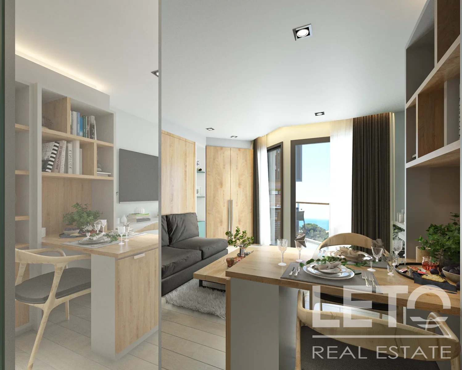 Компактный обеденный стол для двоих трансформируется в кофейный столик у дивана.