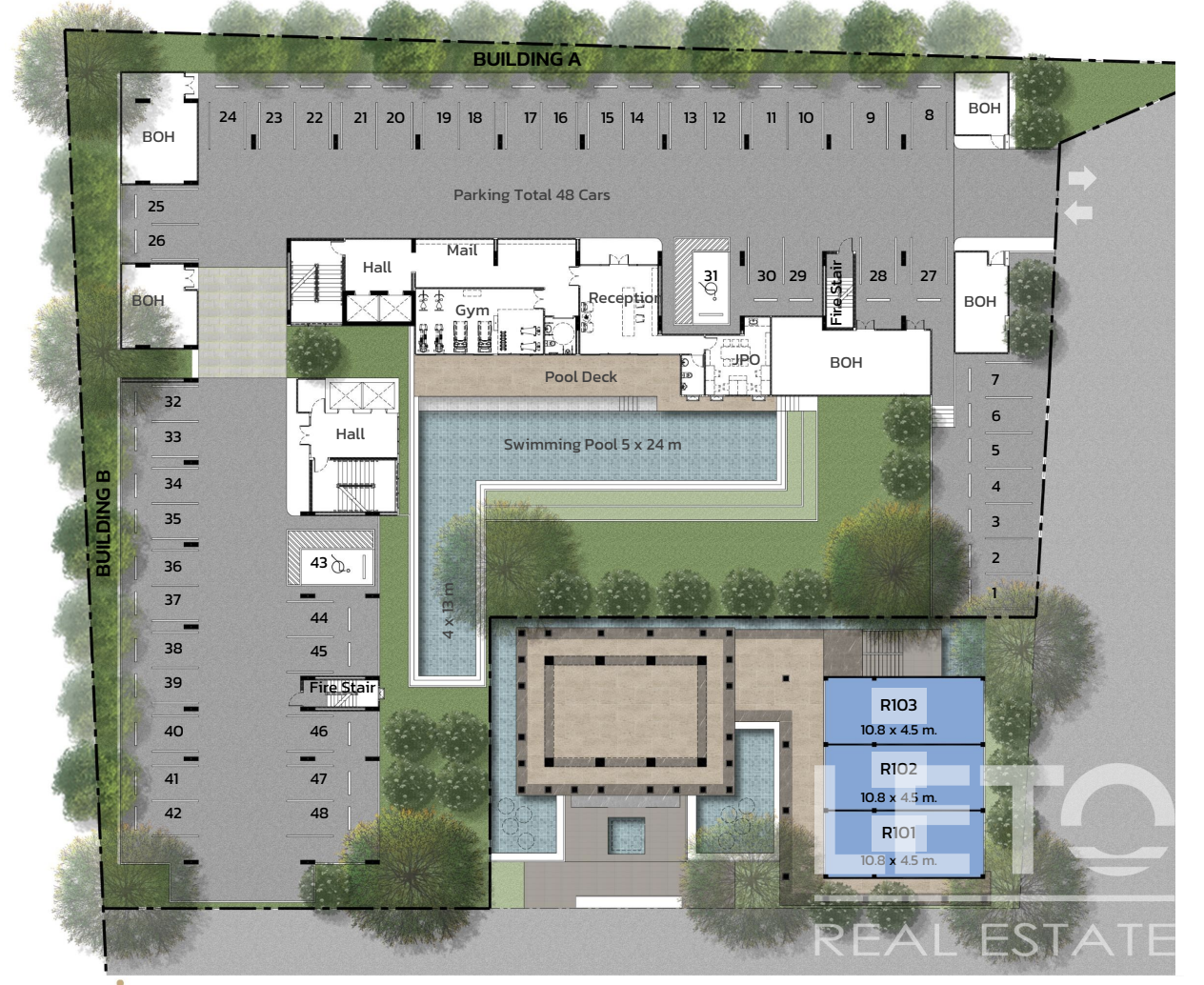 В комплексе открытый бассейн L-формы, а инфраструктура располагается в отдельностоящем здании. Здесь будет тренажерный зал, СПА, сауна, детская площадка и коммерческие юниты для бизнеса.