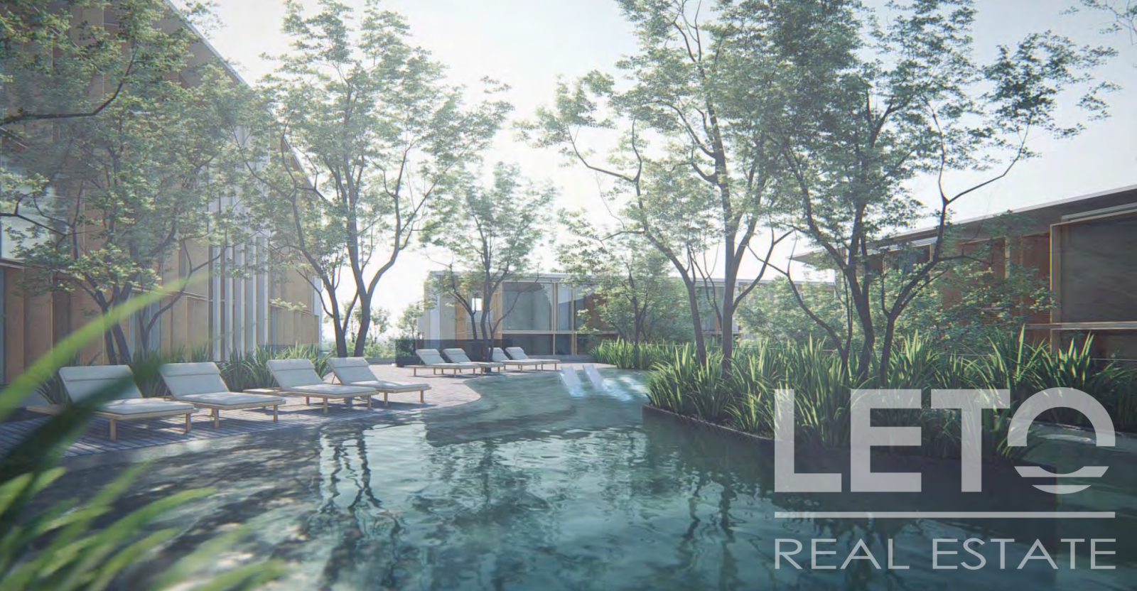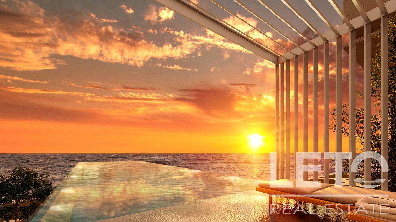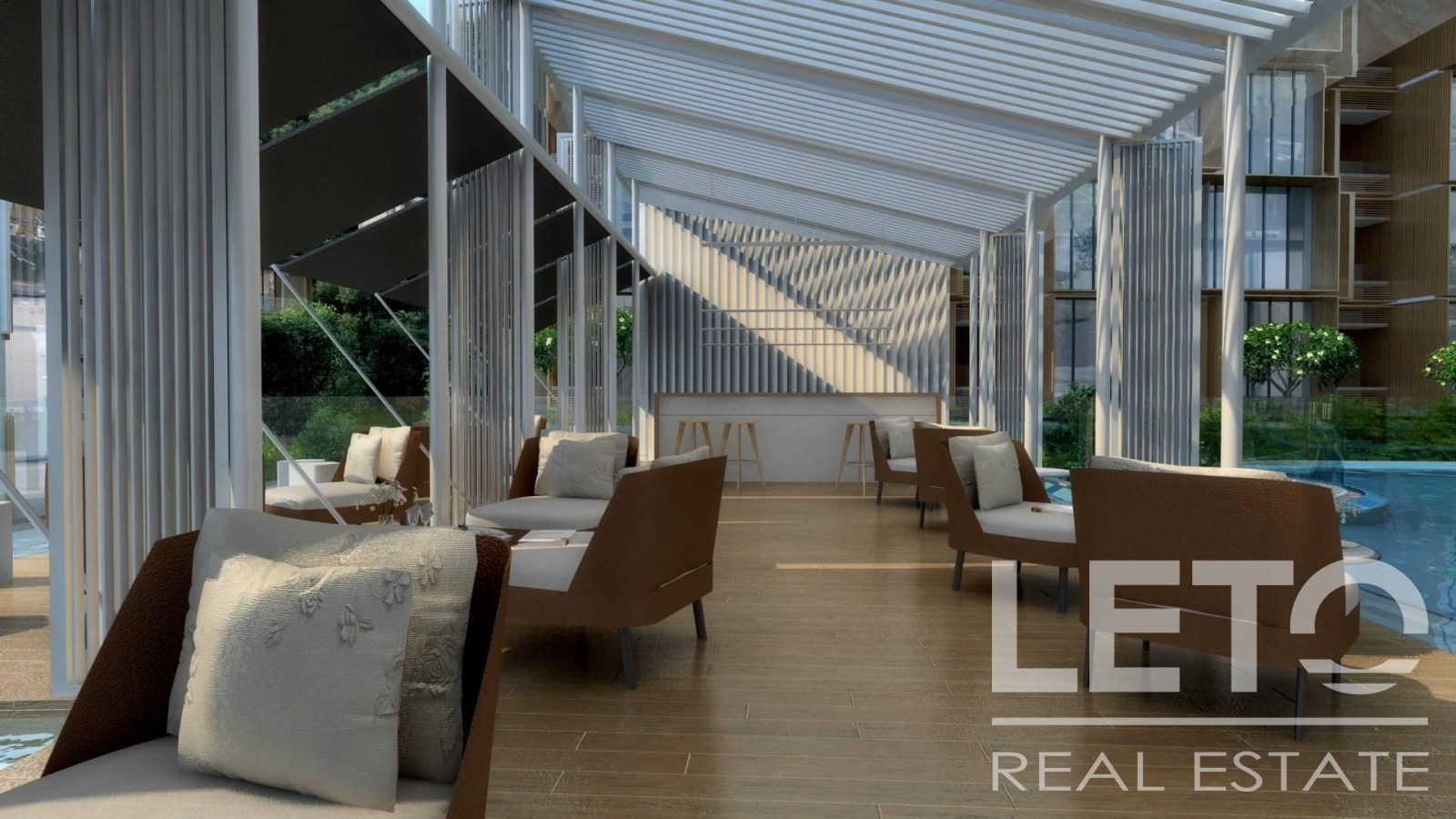 The panoramic windows allow natural light to flood the space and offer a wonderful view of the pool and the surrounding infrastructure.