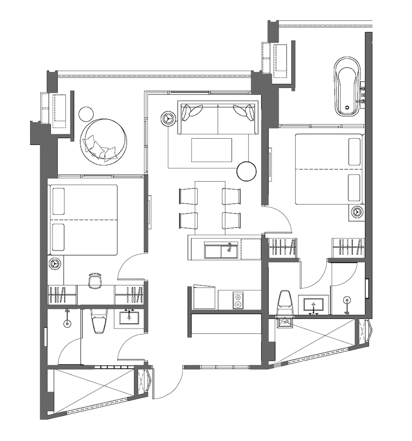 Квартира с двумя спальнями, двумя ванными и просторной террасой для отдыха.