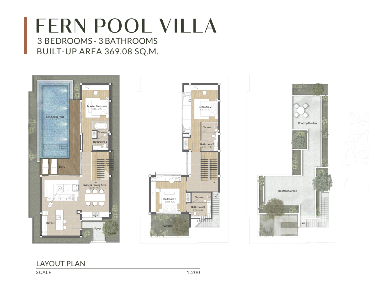 Вилла с бассейном представляет собой дуплекс, на первом этаже которой располагается гостиная и столовая, соединенные с террасой виллы.
