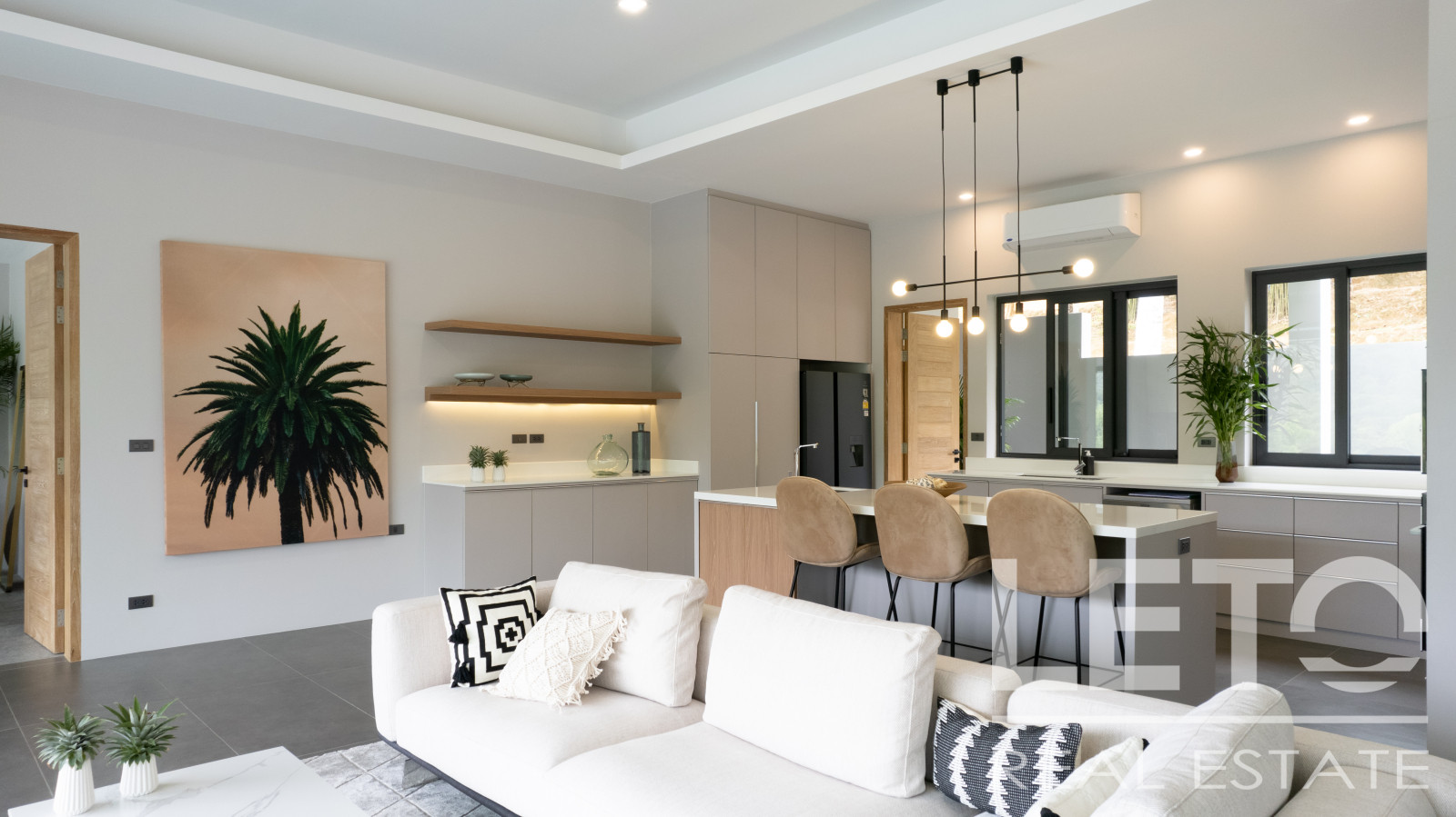 • Открытая планировка кухни в западном стиле с островом и обильным количеством шкафов и встроенной бытовой техникой.