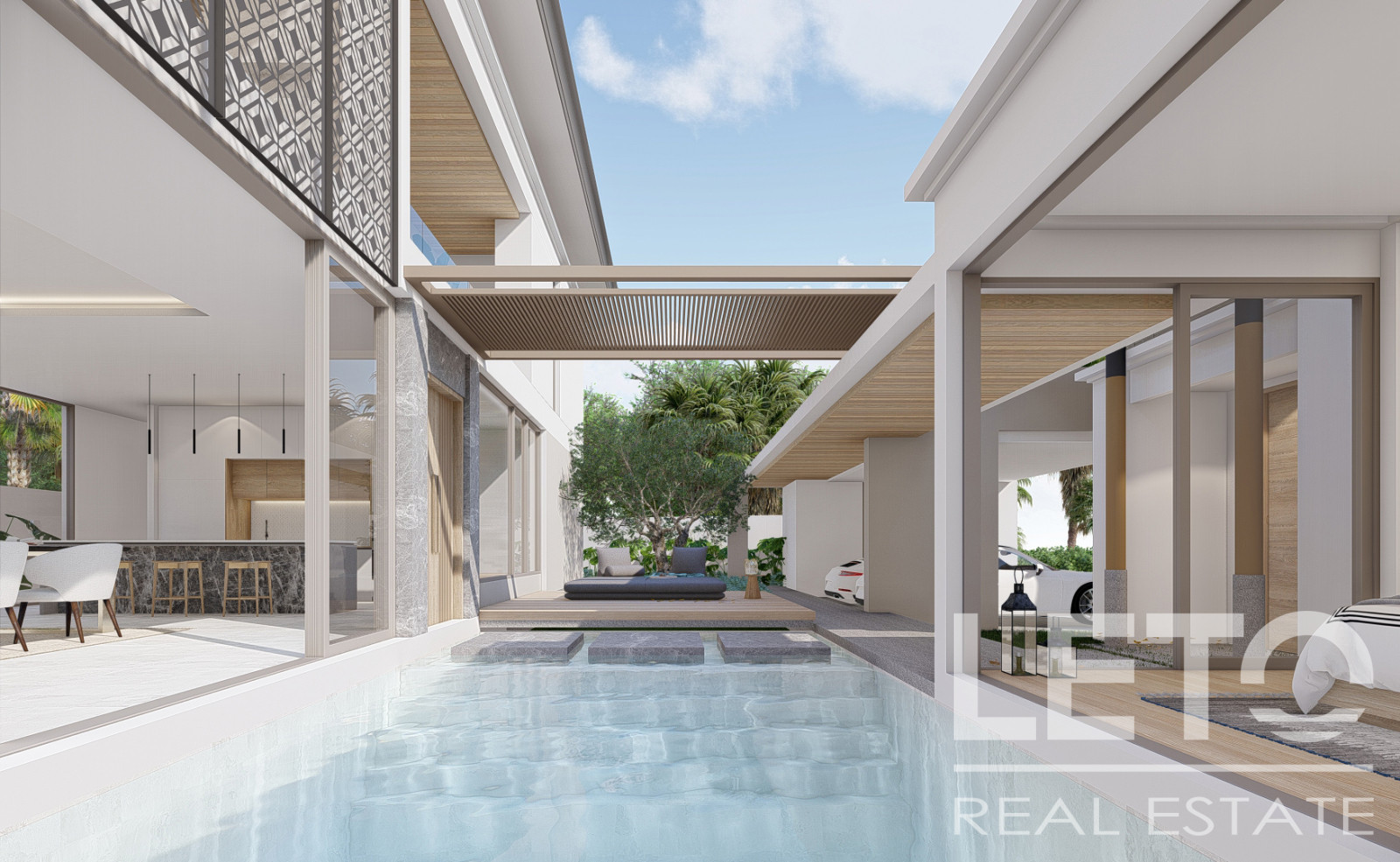 Из панорамных окон гостиной открывается вид на внутренний двор с бассейном, что создает приятную атмосферу релакса.